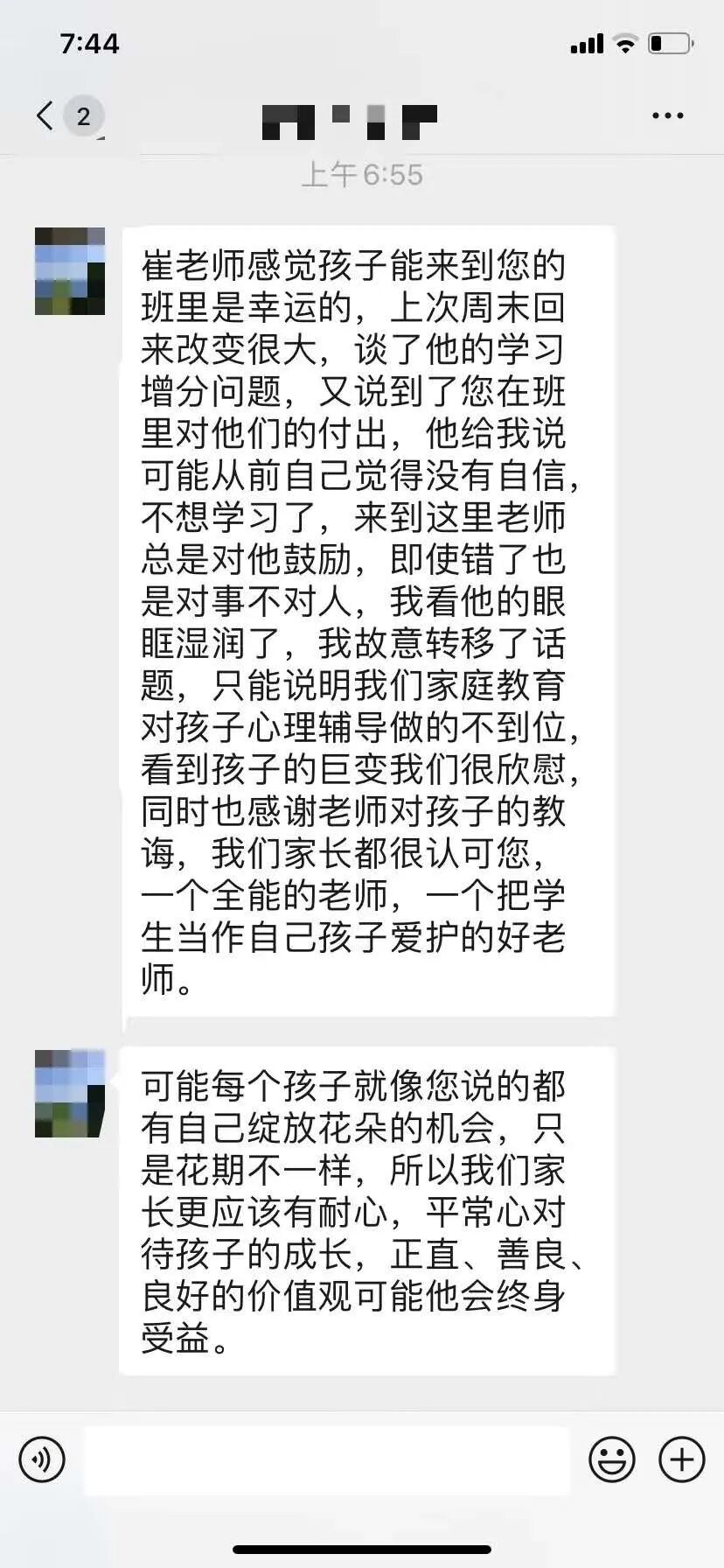 像我们班的秦梓轩,是属于调皮的孩子,刚来就损坏了学校的墙壁。上课状态也有些懒散,曾就因为管理太严,在家长会时写过纸条给他爸爸,说:“这个学校管理太严,我要回去”。但当他从原学校的班级倒数,到回原学校考试时的24名,他完全改变了心态,上次回去考试时给我说“老师,我这次更有信心了”。在原学校考完试不想耽误这边课程,马上要求回学校。