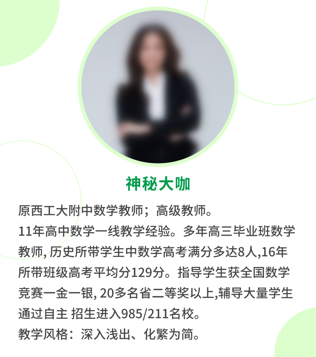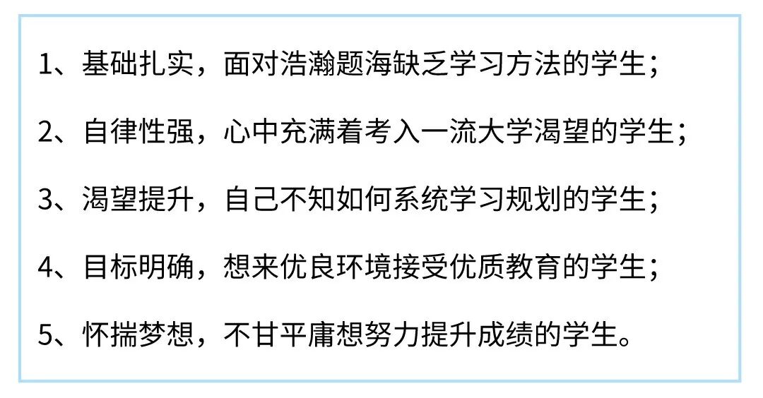 教师选拔优中选优,所有教师具备8年以上毕业班带班经验,所有教师具有五大名校授课经历且都全部参与过往届高考真题、模拟测试题等教研活动。